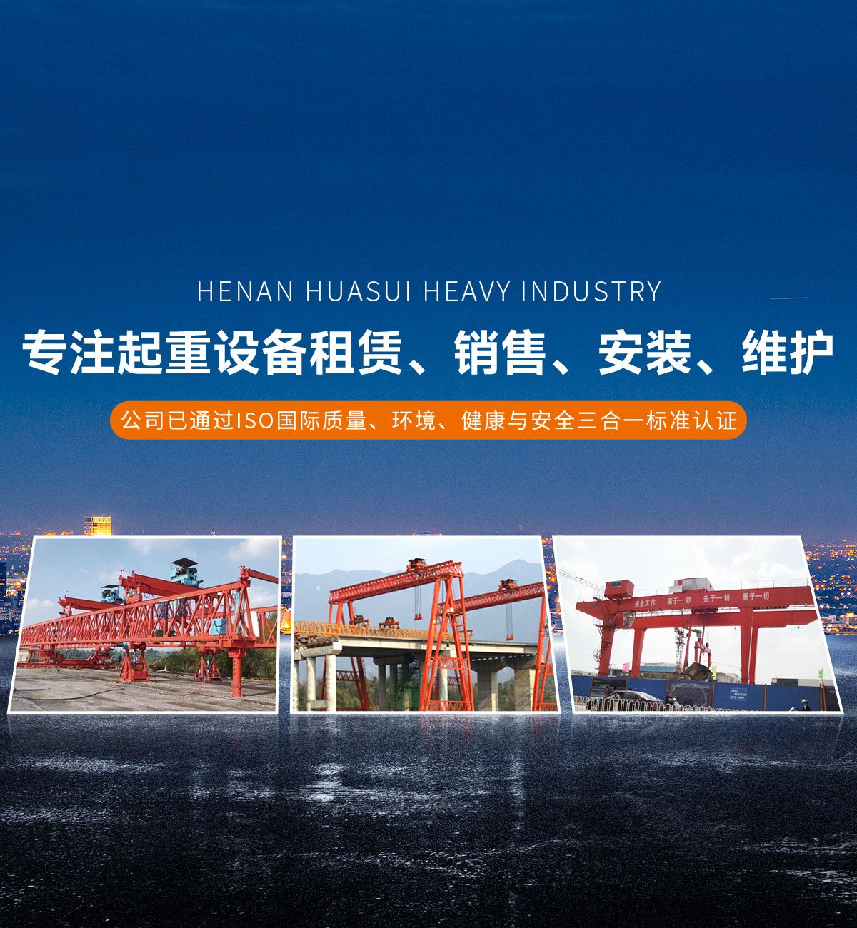 河南華隧重工機(jī)械裝備有限公司主要從事通用門式起重機(jī)、橋式起重機(jī)、電動(dòng)單梁起重機(jī),輪胎式起重機(jī)、架橋機(jī)、提梁機(jī)、遠(yuǎn)梁平車、鋼絲繩電動(dòng)萌蘆、卷揚(yáng)機(jī)、起重配件制造、銷售:起重機(jī)械租賃、安裝和維修,起重設(shè)備園收,機(jī)械設(shè)備維修,鋼結(jié)構(gòu)工程承包,橋梁工程及技術(shù)咨淘服務(wù),銷售五金制品、機(jī)電設(shè)備:建設(shè)工程監(jiān)理,建設(shè)工程設(shè)計(jì),各類工程建設(shè)活動(dòng),建筑勞務(wù)分包,建筑物折除作業(yè),施工作業(yè),工程管理服務(wù),土石方工程施工,裝如發(fā)運(yùn)。  公司已通過IS0國際質(zhì)量、環(huán)境、健康與安全三合一標(biāo)準(zhǔn)認(rèn)證,特種設(shè)備制造許可證和特種設(shè)備安裝改造維修許可證。擁有完熟的質(zhì)量管理體系。嚴(yán)格的管理制度,強(qiáng)大的生產(chǎn)能力和先進(jìn)的檢測手段,在保證產(chǎn)品質(zhì)量的同時(shí),也具備了極強(qiáng)的市場競爭力。  公司堅(jiān)持科技創(chuàng)新為理念,產(chǎn)品質(zhì)量為核心,注重信譽(yù),建立了減信可靠、快捷、思速。便利周到的售后服務(wù)網(wǎng)絡(luò)。  我們擁有的技術(shù)專家和技術(shù)服務(wù)隊(duì)伍為客戶提供充善的售前技術(shù)支持和全天候的售后服務(wù)體系,讓您無后顧之憂,享受一站式的超值服務(wù)。  “華隧重工,伴您成功“是華隧重工永遠(yuǎn)的宗指,真被的希望與各界朋友攜手并進(jìn)。共創(chuàng)輝準(zhǔn)!
